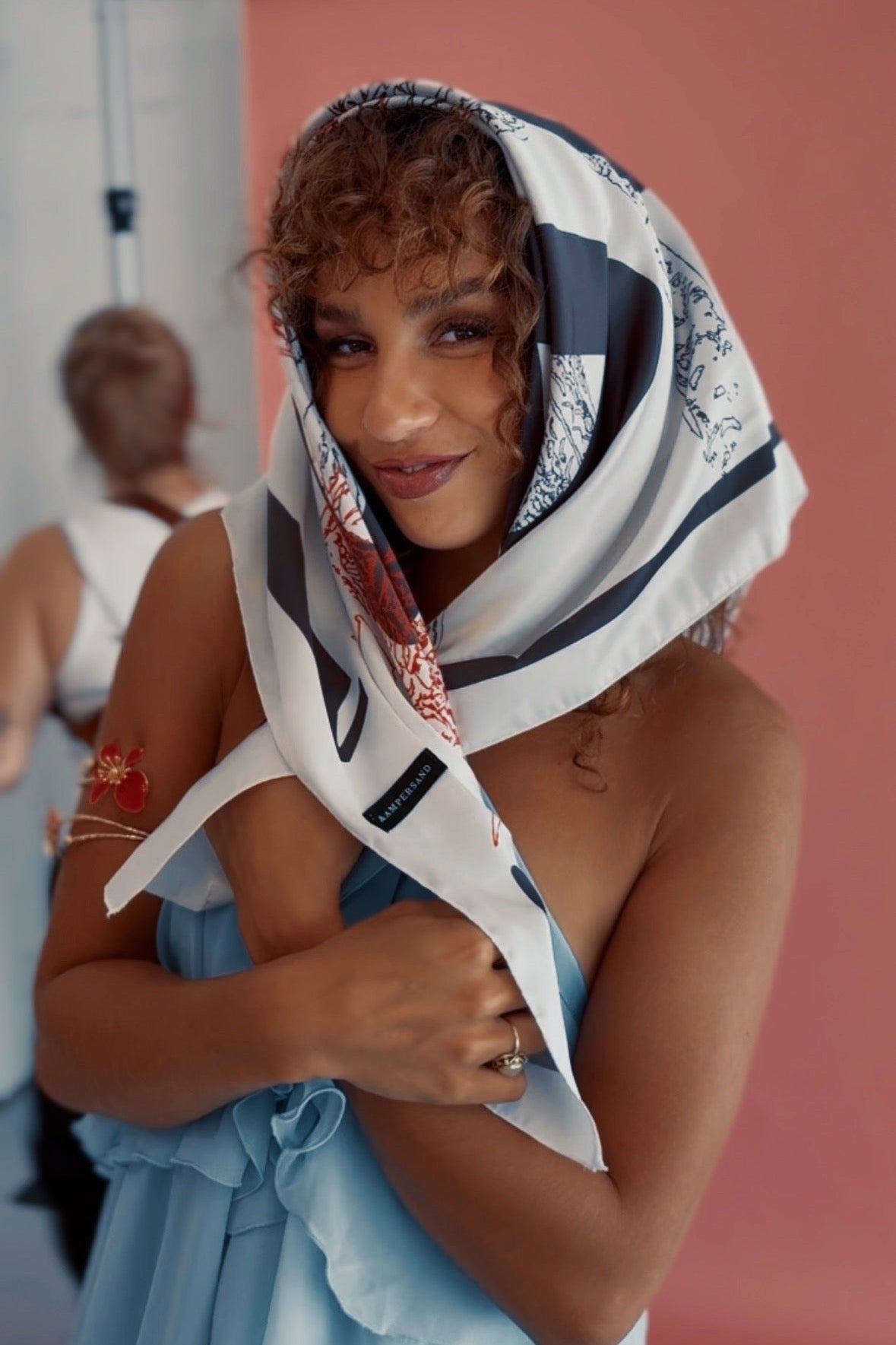 Creme kleurig zijde sjaaltje, met de opdruk van de print Giftige Slangen.